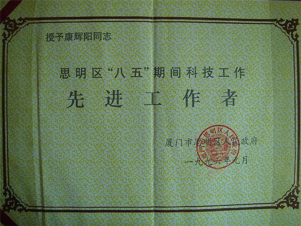 康輝陽同志1996年思明區(qū)“八五”期間科技工作先進(jìn)工作者
