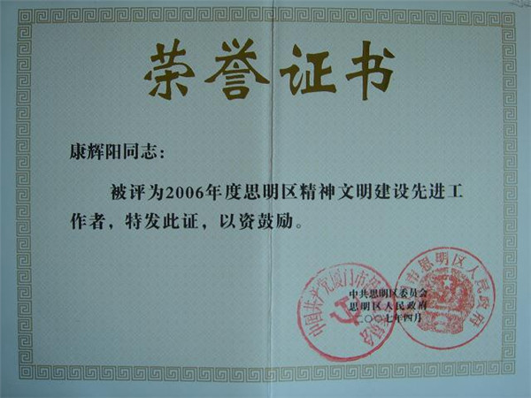 康輝陽同志2006年度思明區(qū)精神文明建設先進工作者