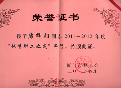 廈門市工會授予康輝陽同志2012年度廈門市優(yōu)秀職工之友