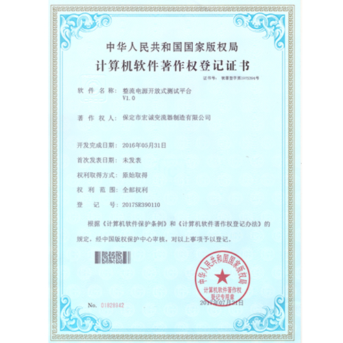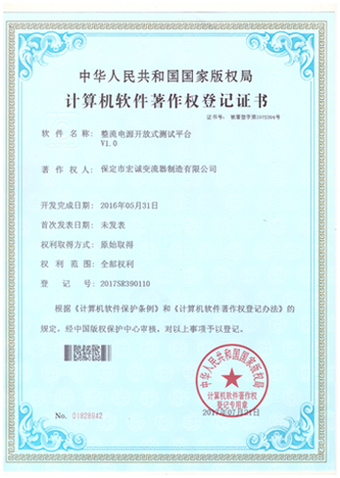 • 計(jì)算機(jī)軟件注冊(cè)權(quán)登記證書——整流電源開(kāi)放式測(cè)試平臺(tái)V1.0