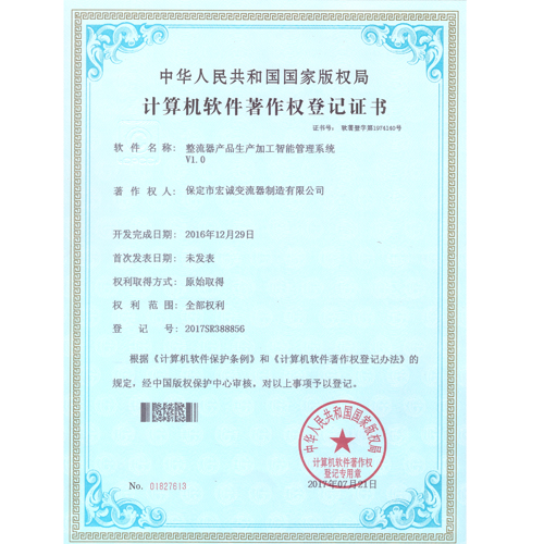 • 計(jì)算機(jī)軟件注冊(cè)權(quán)登記證書——整流器產(chǎn)品生產(chǎn)加工智能管理系統(tǒng)V1.0