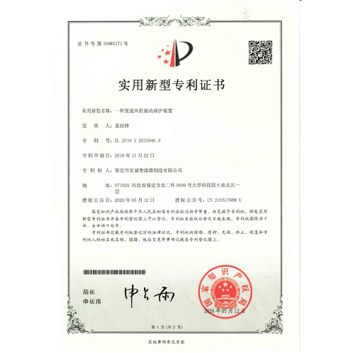 • 實(shí)用新型專利證書一種變速風(fēng)機(jī)驅(qū)動(dòng)保護(hù)裝置