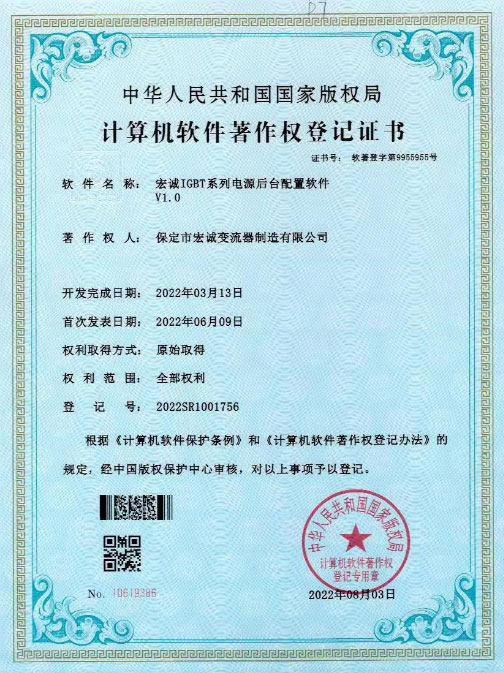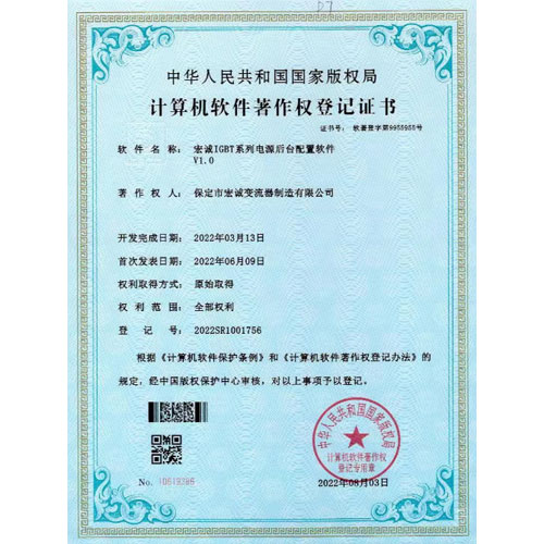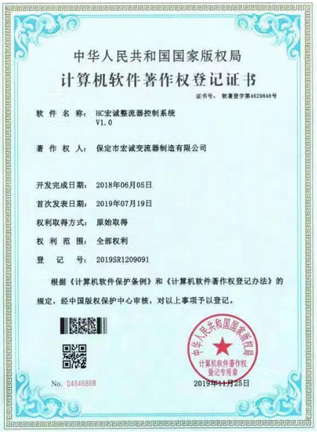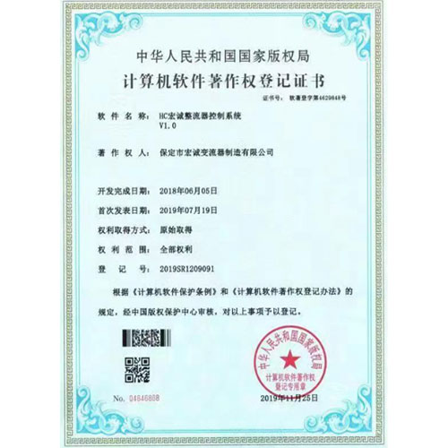 • 計(jì)算機(jī)軟件著作權(quán)登記證書--HC宏誠(chéng)整流器控制系統(tǒng)V1.0