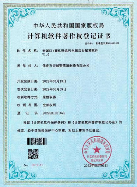 • 計(jì)算機(jī)軟件著作權(quán)登記證書--Sic碳化硅系列電源后臺(tái)配置軟件V1.0